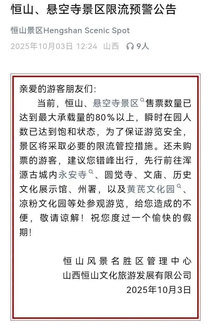 恒山、悬空寺限流预警公告