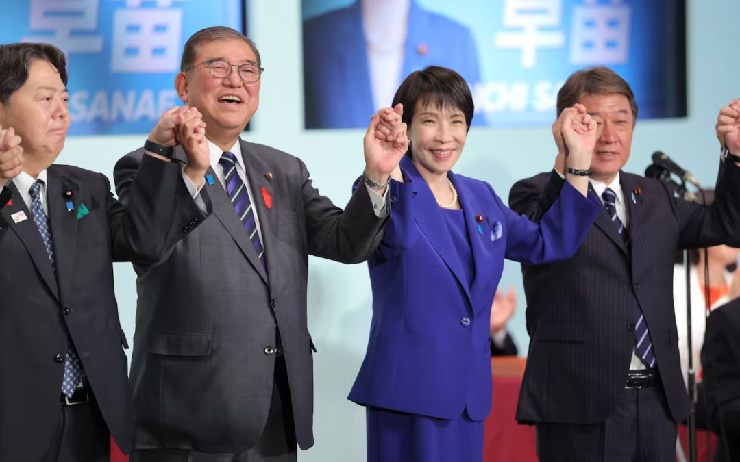 ◆10月4日,高市早苗(右二)当选日本自民党第29任总裁,成为该党首位女总裁,并有望成为日本首位女首相。