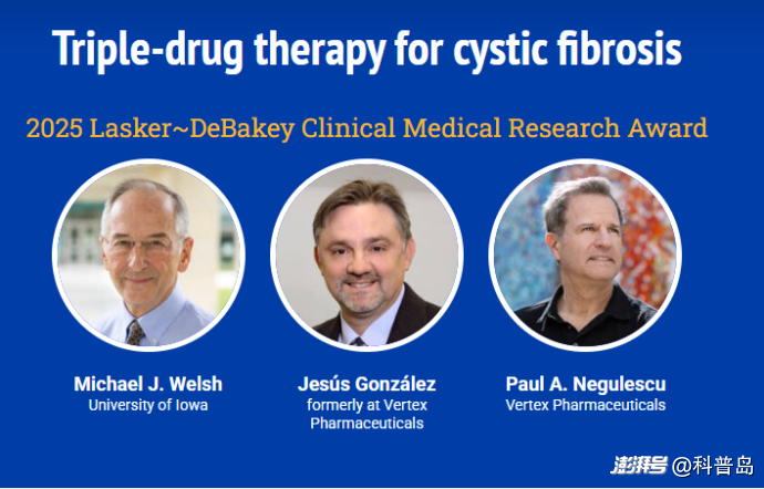 今年最大焦点是囊性纤维化(Cystic Fibrosis, CF)研究:Michael J. Welsh & Paul Negulescu揭示了CFTR 蛋白缺陷的分子机制,Jesús (Tito) González开创了一种用于筛选化学库中潜在化合物的系统,而 Paul A. Negulescu 则领导并倡导了CF项目,最终开发出一种三联疗法,将CF转变为一种可控的疾病。