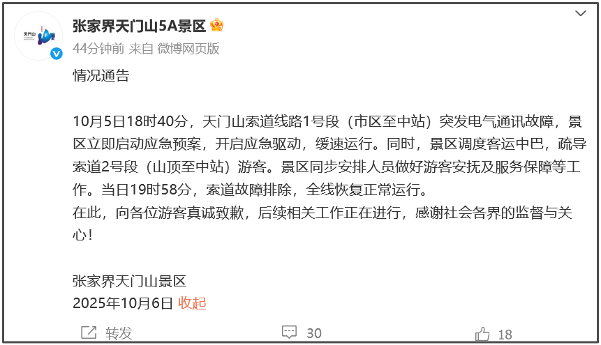 10月6日,@张家界天门山5A景区 发布情况通告: