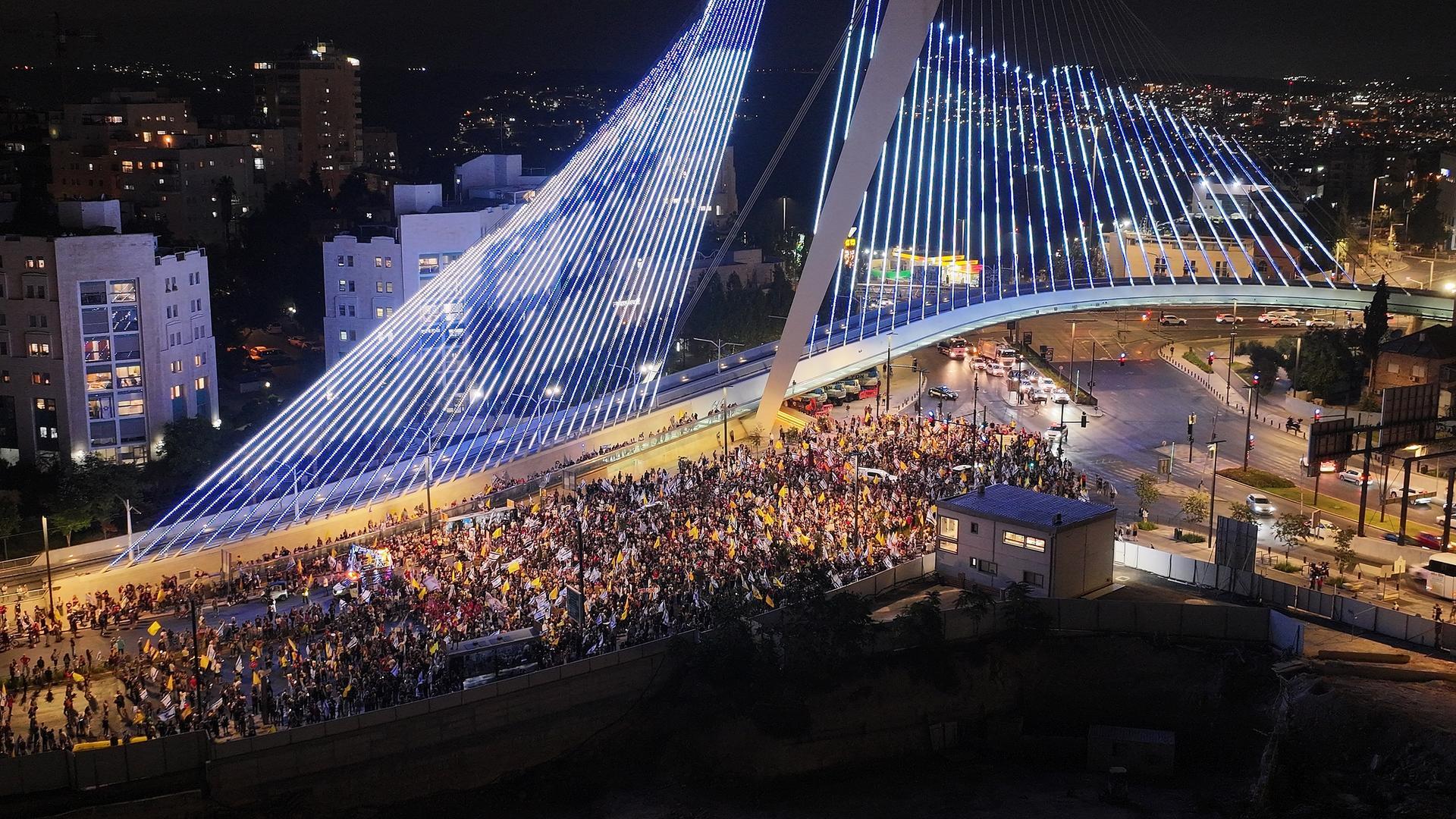 ▲当地时间2025年9月6日,耶路撒冷,人们聚集在西耶路撒冷入口处的琴弦桥前,游行要求释放加沙地带的人质并结束战争 图据视觉中国