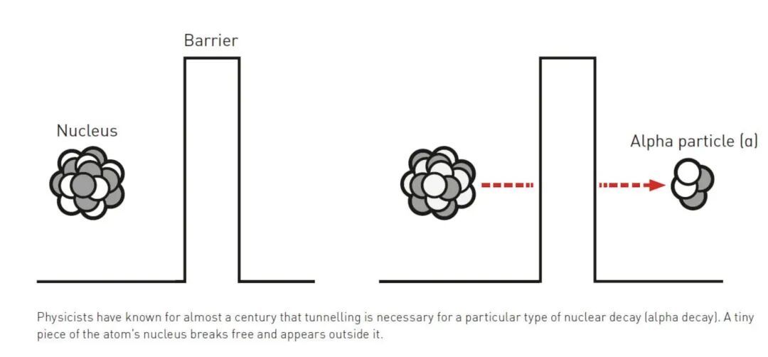 物理学家已经知道,隧道效应对于一种特定类型的核衰变(α衰变)来说是必需的。原子核中的一小部分会脱离原子核并出现在原子核的外面。这里强调了隧道效应在α衰变过程中的重要性,解释了α衰变过程中α粒子是如何从原子核内部穿越势垒(Barrier)而逃逸到原子核外部的现象。图源:Johan Jarnestad/The Royal Swedish Academy of Sciences
