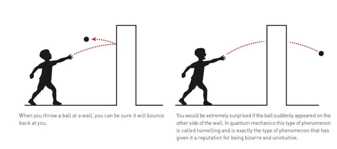 这张图用生活中的一个例子(球扔向墙壁会反弹)来解释量子力学中的隧道效应。在量子力学的微观世界里,微观粒子有一定的概率穿过原本看似不可逾越的“墙壁”,出现在墙壁的另一侧。这与我们日常中基于经典物理形成的直觉相违背,所以让人觉得量子力学很“怪异”。图源:Johan Jarnestad/The Royal Swedish Academy of Sciences