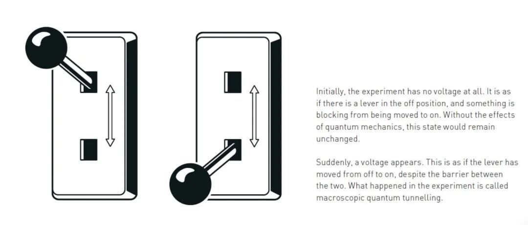 这张图片描述了一个实验现象,实验开始时没有电压,就像一个被障碍物阻挡的杠杆处于关闭位置。在经典物理学中,这种状态会一直保持。但是量子力学允许电压“隧穿”过障碍物,使得电压突然出现,这种现象被称为宏观量子隧穿。图源:Johan Jarnestad/The Royal Swedish Academy of Sciences