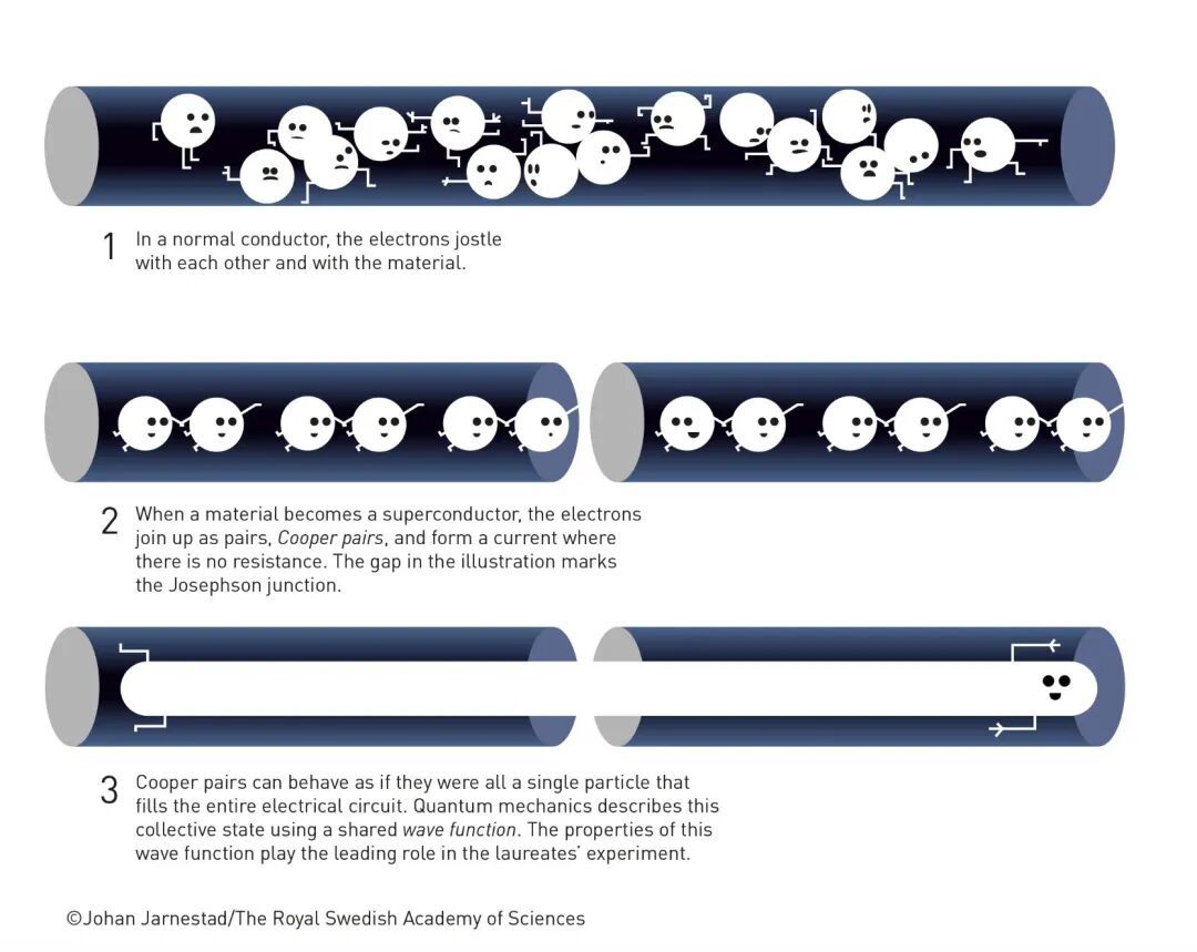 1、在普通的导体中,电子之间会相互碰撞,同时也会与导体材料发生碰撞。2、当一种材料变成超导体时,电子会成对结合,形成库珀对,并且形成一种没有电阻的电流。图中的空白部分表示的是约瑟夫森结。3、库珀对可以表现得像一个单一的粒子,充满了整个电路。量子力学使用共享的波函数来描述这种集体状态。这个波函数的性质在获奖者的实验中起着主导作用。图源:Johan Jarnestad/The Royal Swedish Academy of Sciences