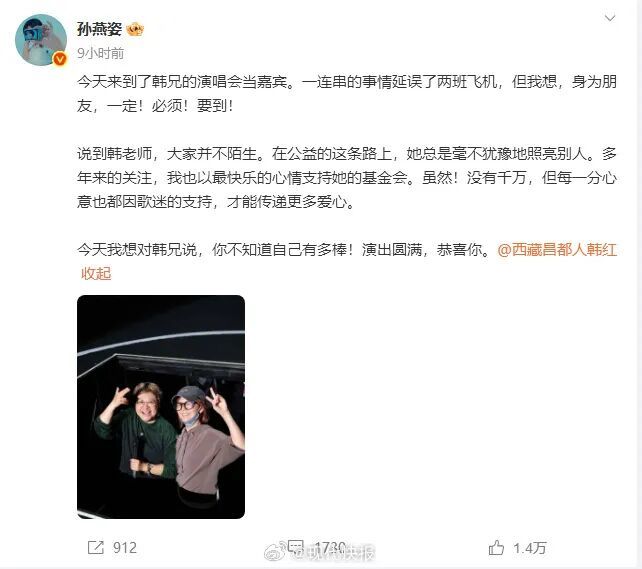 针对此事,10月7日晚,孙燕姿在社交平台发文回应:今天来到了韩兄的演唱会当嘉宾。一连串的事情延误了两班飞机,但我想,身为朋友,一定!必须!要到!