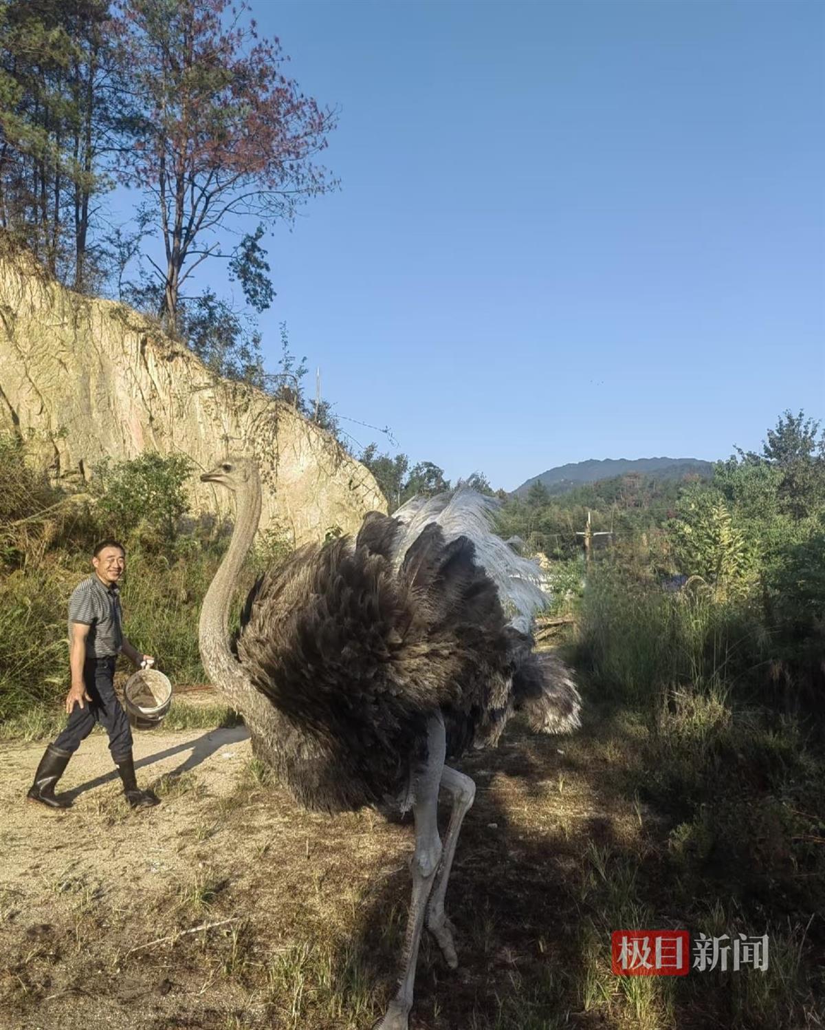 “一开始不知道它能长这么大。”何女士说,三只鸵鸟刚购入时仅两个月大,体型与成年公鸡相近;如今存活的三鸵已长成2米高、200多斤重,甚至成为全村的“景点”,每逢有村民回村探亲,家中孩子总会前来探望三鸵,并主动投喂食物。
