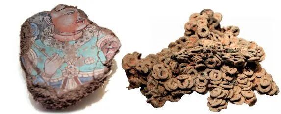 左图:木舒克市附近一处佛寺遗址内的壁画残块,唐代;右图:龟兹五铢钱,汉代。图/视觉中国 新华