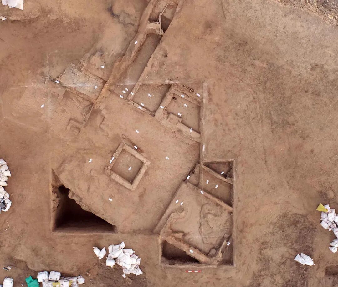 2023年的发掘中,东侧大外城城墙夯土台基的边缘露出了佛寺一角,经过勘测,初步认定有7000多平方米的规模。这与伯希和1906年发掘的托库孜萨来佛寺几近相同,而且彼此呈东西对称之势。同时,高台城内也发现了一处疑似的寺庙遗迹,其形制为中心设一边长2.3米的方形水池,周以方形露天庭院,庭院外分布5处小型房址,院落东侧外有方砖铺路。