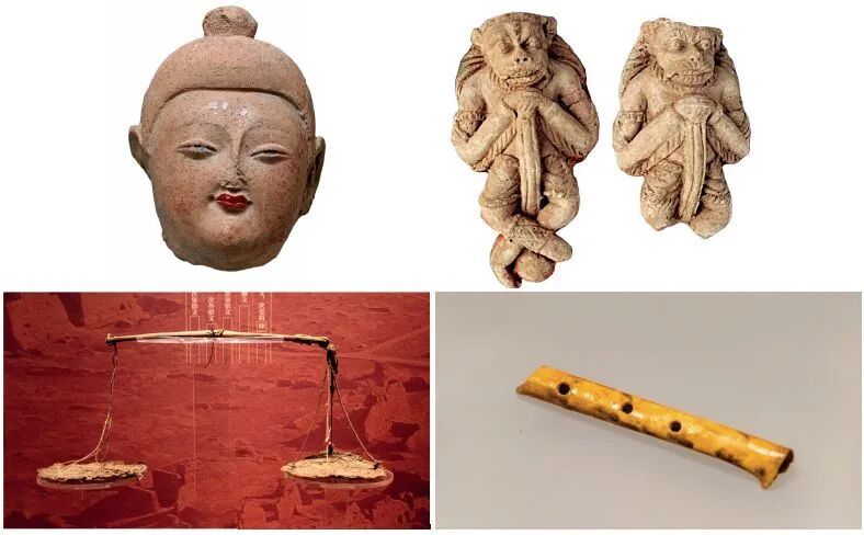 托库孜萨来遗址出土文物:(上左)泥塑佛头像,北朝;(上右)泥塑;(下左)布天秤,唐代;(下右)骨笛,北朝;图/视觉中国 新华