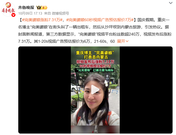 近日,国庆假期期间,重庆一博主“完美婆娘”在街头叫了一辆出租车,然后从沙坪坝到内蒙古旅游引发关注。随后,相关话题冲上热搜。
