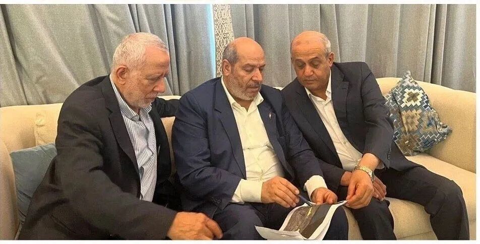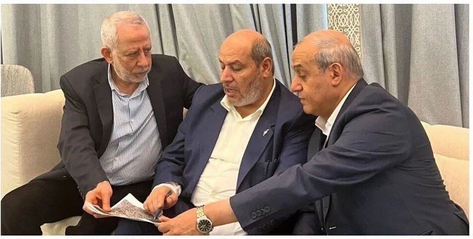会谈现场照片显示,哈马斯领导人、谈判代表团团长哈利勒·海亚,与“杰哈德”副领导人穆罕默德·欣迪、“人阵”副领导人贾米勒·马兹赫尔,齐聚埃及的沙姆沙伊赫,就详细标明以色列从加沙分阶段撤军的地图展开磋商。