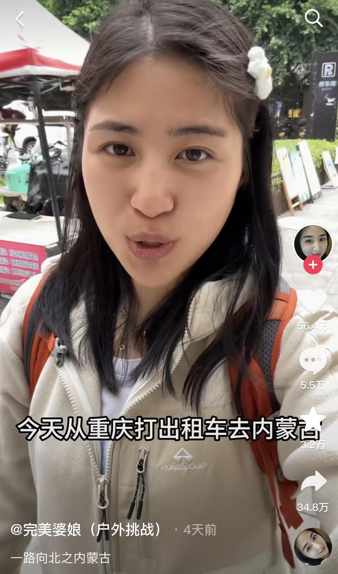 近日,重庆网红“完美婆娘”打出租车去内蒙古的视频在网络引发关注。视频中,“完美婆娘”拦了多辆出租车遭到拒绝,随后拦到了一辆出租车,搭上车出发内蒙古。这个视频在短视频平台点赞已经超过56万。