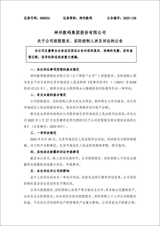 10月10日深夜,神州数码集团股份有限公司(以下简称为“神州数码”)发布公告,披露了公司控股股东、实际控制人郭为离婚案的一审判决结果。