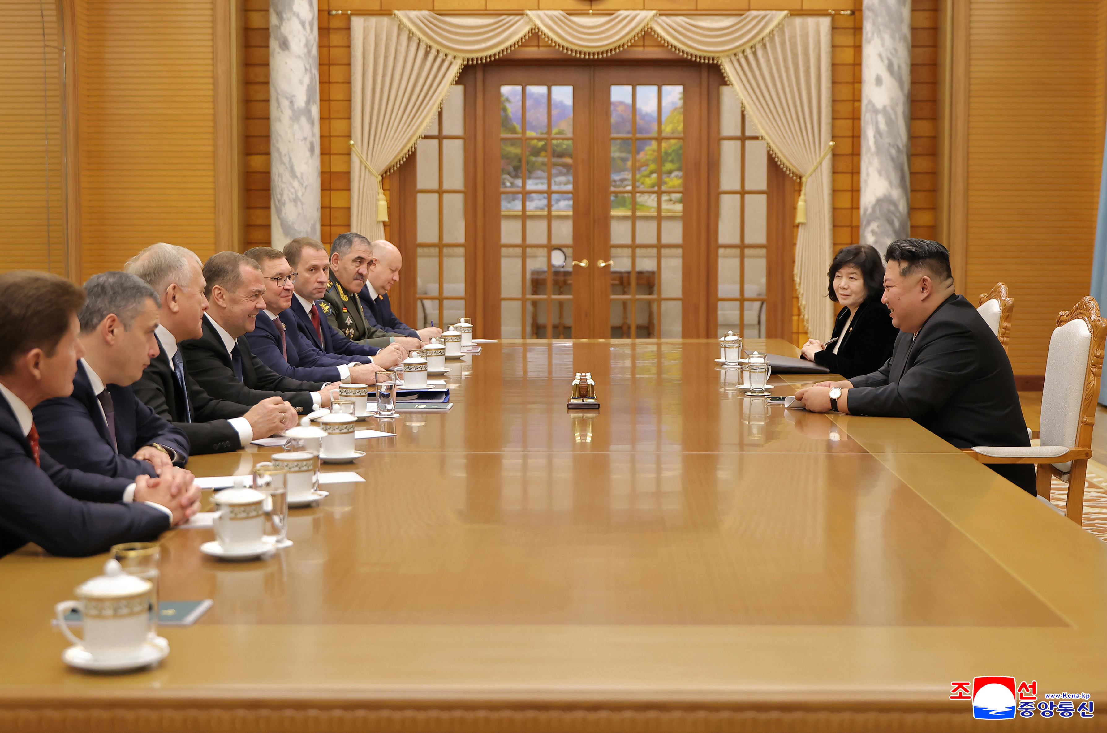 10月10日,朝鲜劳动党总书记、国务委员长金正恩(右一)在平壤会见统一俄罗斯党主席梅德韦杰夫(左四)。新华社/朝中社