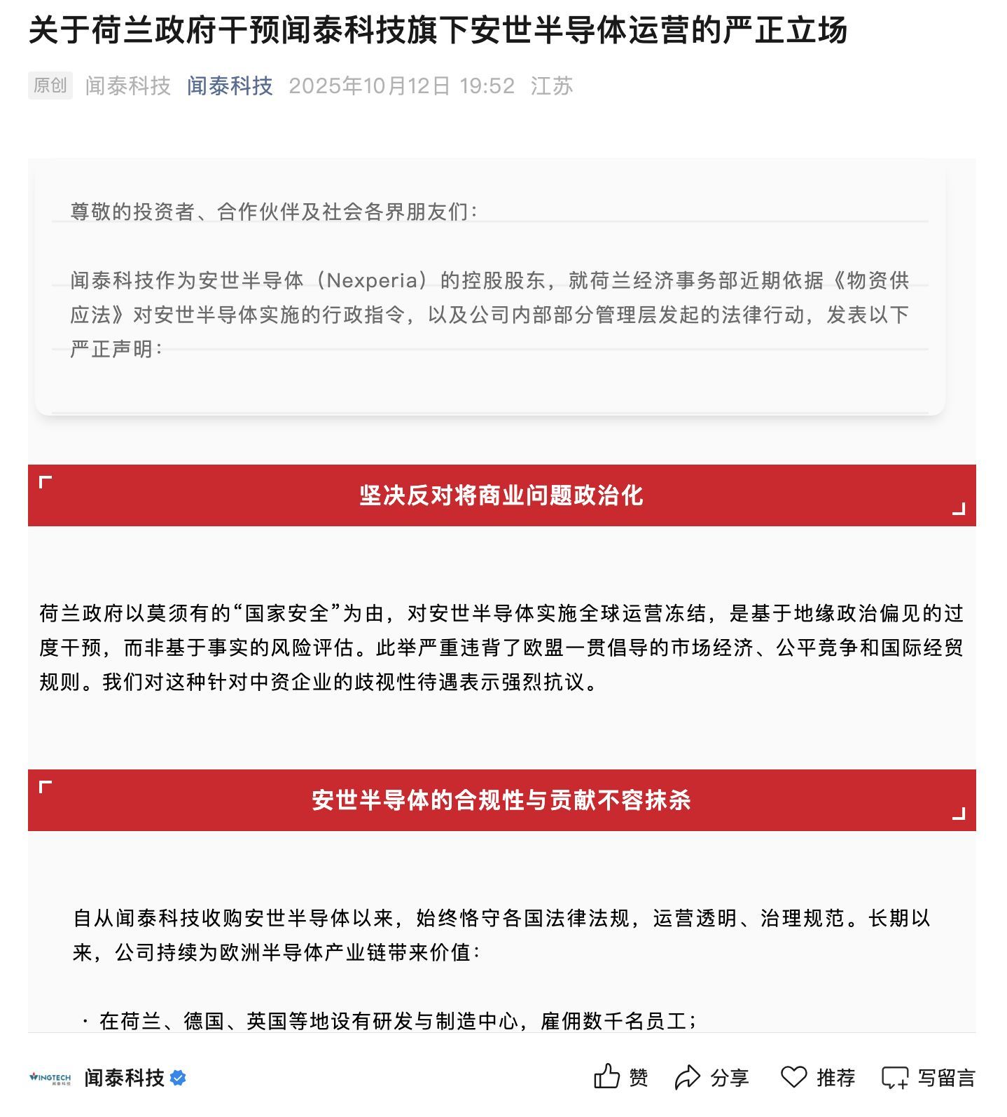 10月12日晚间,闻泰科技(600745.SH,股价46.48元,市值578.48亿元)发表声明称,荷兰政府以莫须有的“国家安全”为由,对安世半导体实施全球运营冻结,是基于地缘政治偏见的过度干预,而非基于事实的风险评估。此举严重违背了欧盟一贯倡导的市场经济、公平竞争和国际经贸规则。