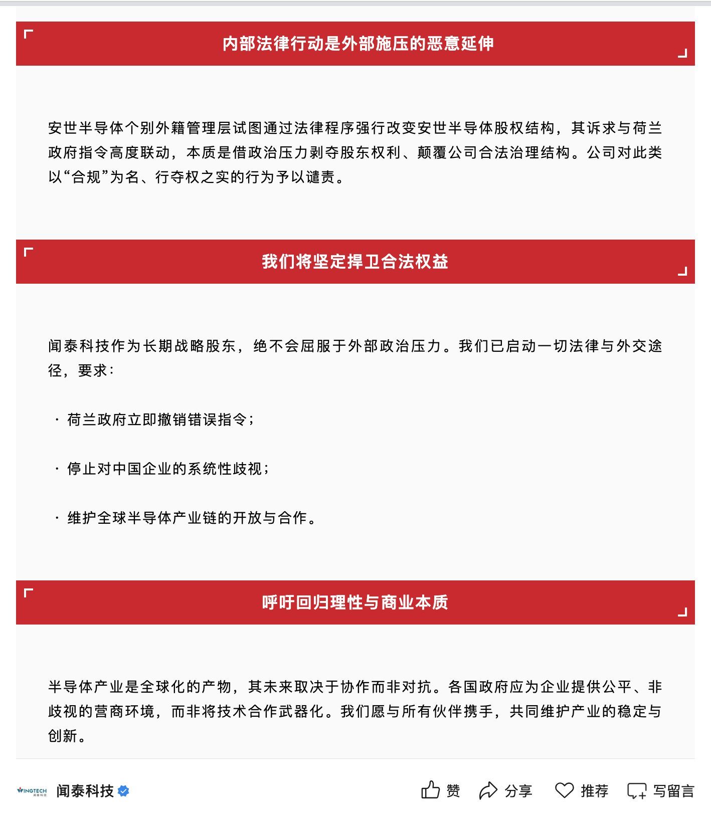 此外,闻泰科技方面呼吁各方应尊重商业规律和全球半导体产业的共生关系,停止将企业作为地缘政治博弈的棋子。一个碎片化、政治化的全球供应链,最终将损害所有参与者的利益。