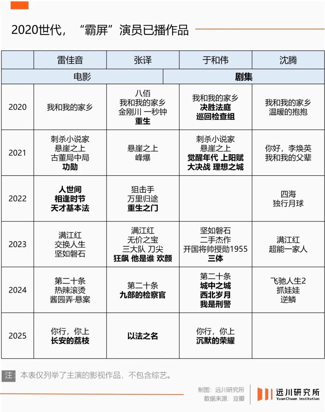 这里我们稍作总结:在政策红利释放前的上个周期,由于题材限令(事)和艺人塌房(人)叠加的不确定性,导致了大量项目积压,资本回收困难。在此背景之下,基本功和裤腰带同样扎实的中年戏骨,就成了为数不多的安全选项,对其的重复使用,反映了行业试错空间的狭窄。
