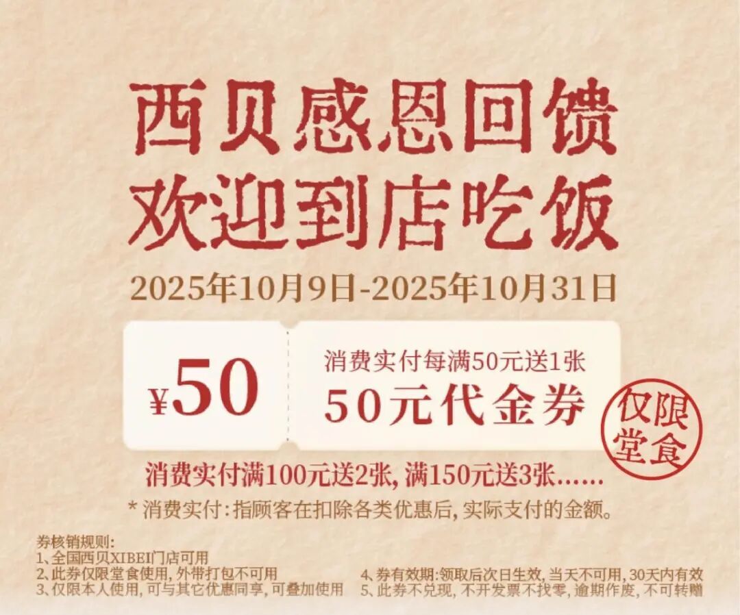 10月9日,据西贝官方信息,2025年10月9日—2025年10月31日,消费实付每满50元送1张50元代金券、消费实付满100元送2张、满150元送3张。