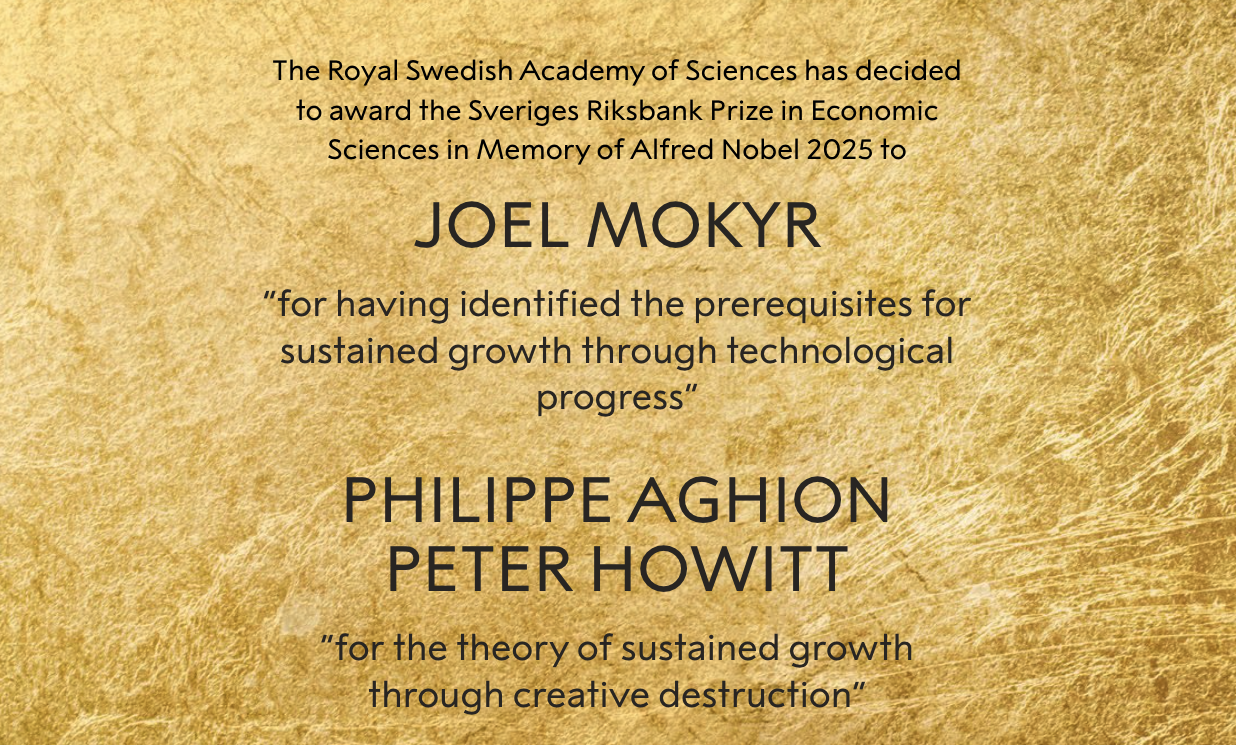 诺贝尔奖官方在颁奖词中写道:“2025年经济学奖得主们向我们揭示:经济持续增长并非理所当然。在人类历史长河中,经济停滞而非增长才是常态。他们的研究表明,我们必须警惕并抵制那些威胁持续增长的因素…若不能应对这些威胁,曾带给我们持续增长的‘创造性破坏’机制或将停摆——届时我们将不得不重新适应经济停滞。”