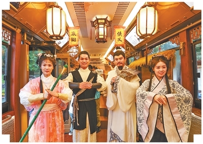 10月5日,湖北襄阳,“黄蓉”“郭靖”“诸葛亮”“黄月英”(从左向右)在“侠义襄阳”旅游公交上与游客互动。杨 东摄(人民视觉)