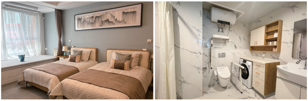 左图:北京顺义,玉兰人家社区的大开间,卧室图。右图:玉兰人家的适老化装修卫生间,足够宽敞,可供轮椅进出,并配有助力扶手。摄影/邹碧颖