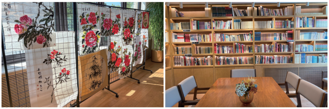 左图:北京顺义,椿萱茂·和园养老社区,入住老人的画作。右图:椿萱茂·和园养老社区的图书馆,摆放着入住老人捐赠的竖版鲁迅全集。摄影/邹碧颖