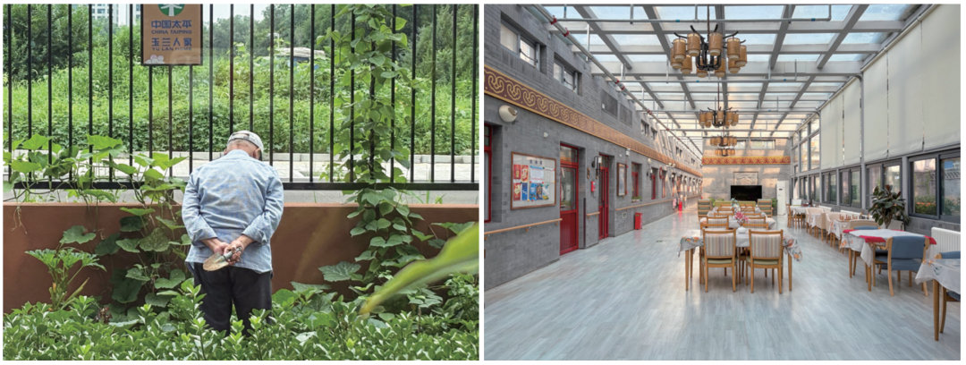 左图:在玉兰人家,入住老年人正在照管自己的小菜园。右图:白纸坊街道养老服务中心后院的公共活动区域。摄影/邹碧颖