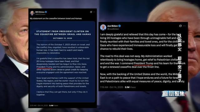 10月8日,加沙停火第一阶段协议达成后,围在特朗普周边的政客们开始对特朗普展开猛烈地“夸夸模式”,甚至是民主党籍前总统克林顿和拜登,都罕见地对特朗普表达了赞美。