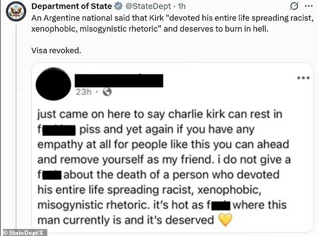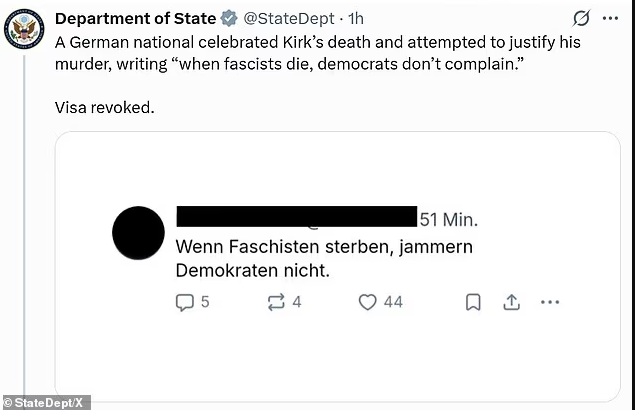 美国国务院刚刚宣布,吊销六名外国人的签证,理由是他们在社交媒体上发表了“嘲讽、侮辱或庆祝”右翼活动人士查理·柯克(Charlie Kirk)遇刺身亡的言论。