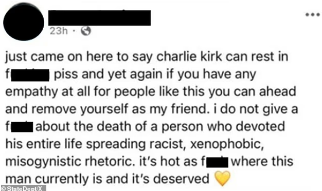 与此同时,美国多地也出现“言论问责”风潮——多名教师、媒体人、甚至公务员因在网上发表被视为“幸灾乐祸”的言论被解雇或停职。