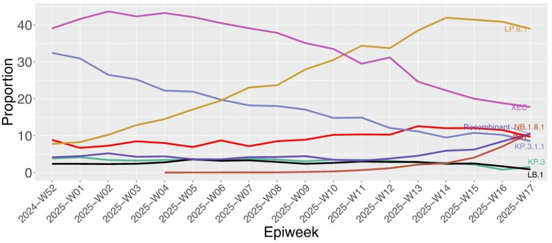 2025年1月至5月SARS-CoV-2关注变体和监测变体的比例|参考资料17