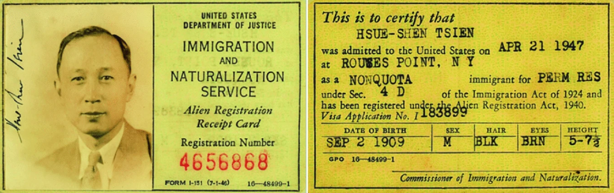 钱学森的永久居住许可证(即现在的绿卡,当时还不是“绿”色),图自Lv, C. (2022). Return to China One Day: The Learning Life of Qian Xuesen (p. 110). Springer Nature
