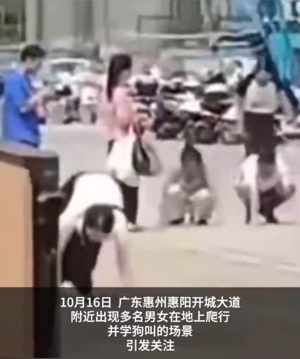 10月16日,广东惠州惠阳开城大道附近出现多名男女在地上爬行并学狗叫的场景。17日,事发地社区工作人员称在调查是哪家公司行为,疑为公司制度。当地派出所工作人员表示已知晓此事,但因未接到报警无法介入处理。