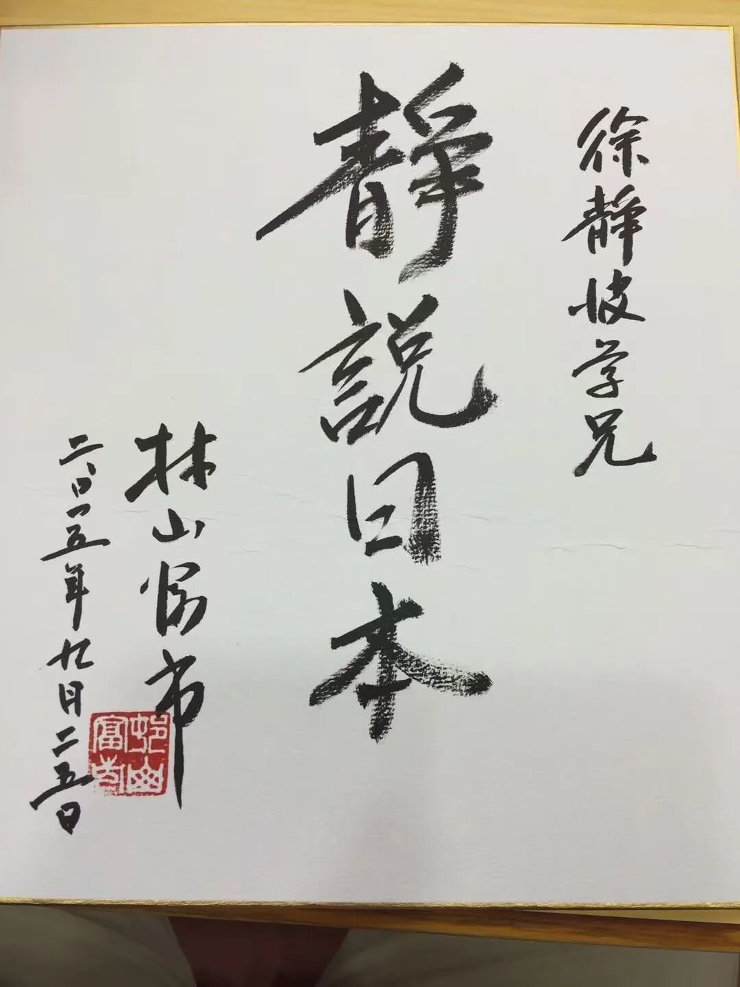 村山先生一听,忙说:“我来帮您题写名称”。于是当场拿来纸笔,写下了“静说日本”四个字。