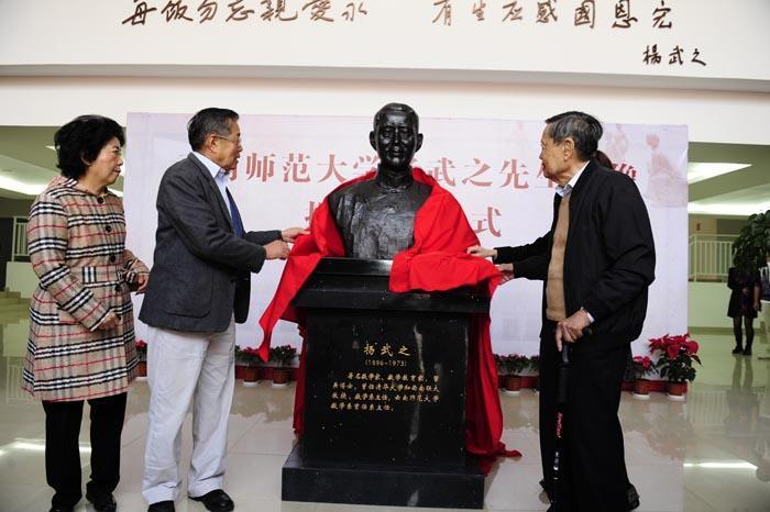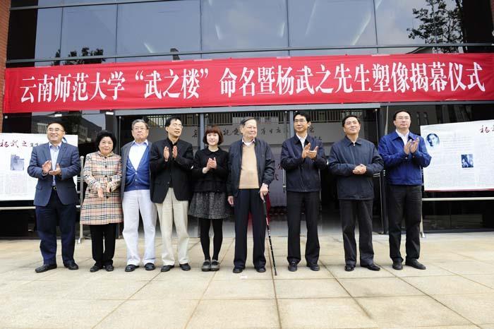 据云南师范大学官网消息,杨振宁是该校终身名誉教授,曾多次回校做客,还给学生们做讲座。2013年10月,在杨武之逝世40周年时,该校将数学学院大楼命名为“武之楼”,并举行杨武之塑像揭幕仪式。当时91岁高龄的杨振宁携夫人翁帆、胞弟杨振汉等人亲临现场,共同为塑像揭幕,“武之楼”也由杨振宁亲笔题写。杨振宁还在西南联大校友友谊林挥锹铲土,同家人一道栽种了一株象征着绵绵联大情和拳拳赤子心的国槐树。