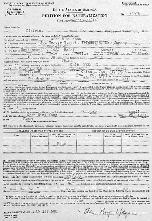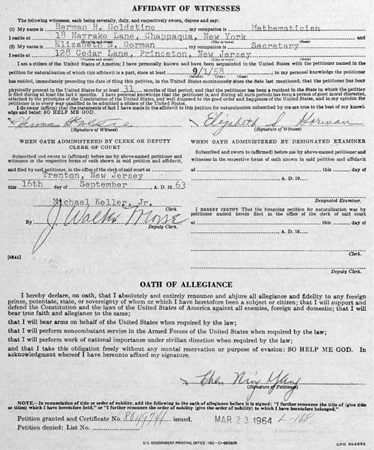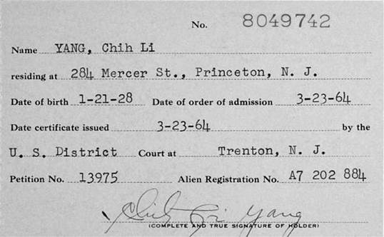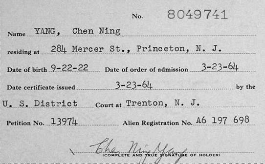 杜致礼滞留台湾无法返美风波发生以后,为了出国访学和旅行方便,杨振宁夫妇急需获得美国永久居留权(俗称美国绿卡)。1953年9月26日,夫妇俩从东京返回,入境美国途经火奴鲁鲁(即檀香山,1959年8月21日夏威夷州成立后成为其首府)时就顺利双双取得美国绿卡。1963年9月16日,杨振宁夫妇在新泽西州首府特伦顿(Trenton)同时申请入籍美国(图5),为夫妇俩入籍提供担保者是2位美国公民(图6):男性担保人是犹太数学家戈德斯坦(Herman Heine Goldstine, 1913—2004),时家住纽约市著名富人区恰帕夸干草耙巷18号(18 Hayrake Lane, Chappaqua, NY),曾是杨振宁在IAS的同事兼密友,时任IBM研究实验室的总部——托马斯·沃森研究中心(Thomas J. Watson Research Center)数学科学主任。女性担保人是秘书戈尔曼(Elizabeth S. Gorman, 1908—1992),时家住新泽西州普林斯顿市雪松巷128号(128 Cedar Lane, Princeton, NJ),时在IAS数学学院分管物理学教授的秘书工作。1964年3月23日,杨振宁夫妇的入籍申请获得批准而正式成为美国公民(图7、图8)。杨、杜伉俪共育2子1女:长子杨光诺,计算机工程师,后转行从事私人金融投资工作,专业级桥牌高手;次子杨光宇(Gilbert Yang, 生于1958年11月19日),实验分析化学博士,先在大学任教,后改习企业管理,遂转行在华尔街从事财务金融工作;独女杨又礼(Eulee Yang, 生于1961年10月18日),医学博士(MD),美国县级医院临床医生。杨家子女均事业有成,家庭和睦美满。