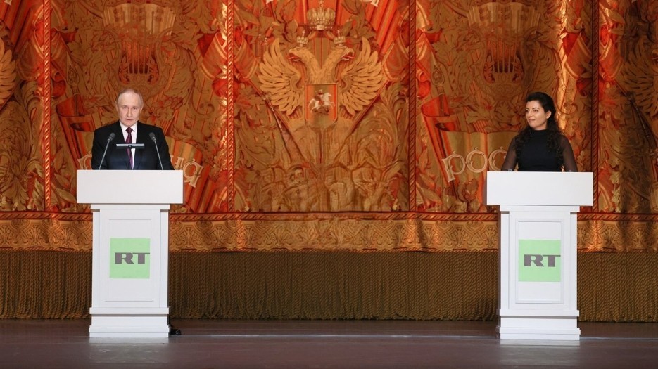 俄罗斯总统普京在“今日俄罗斯”电视台成立20周年庆典晚会现场,右侧为“今日俄罗斯”主编玛格丽塔·西蒙尼扬
