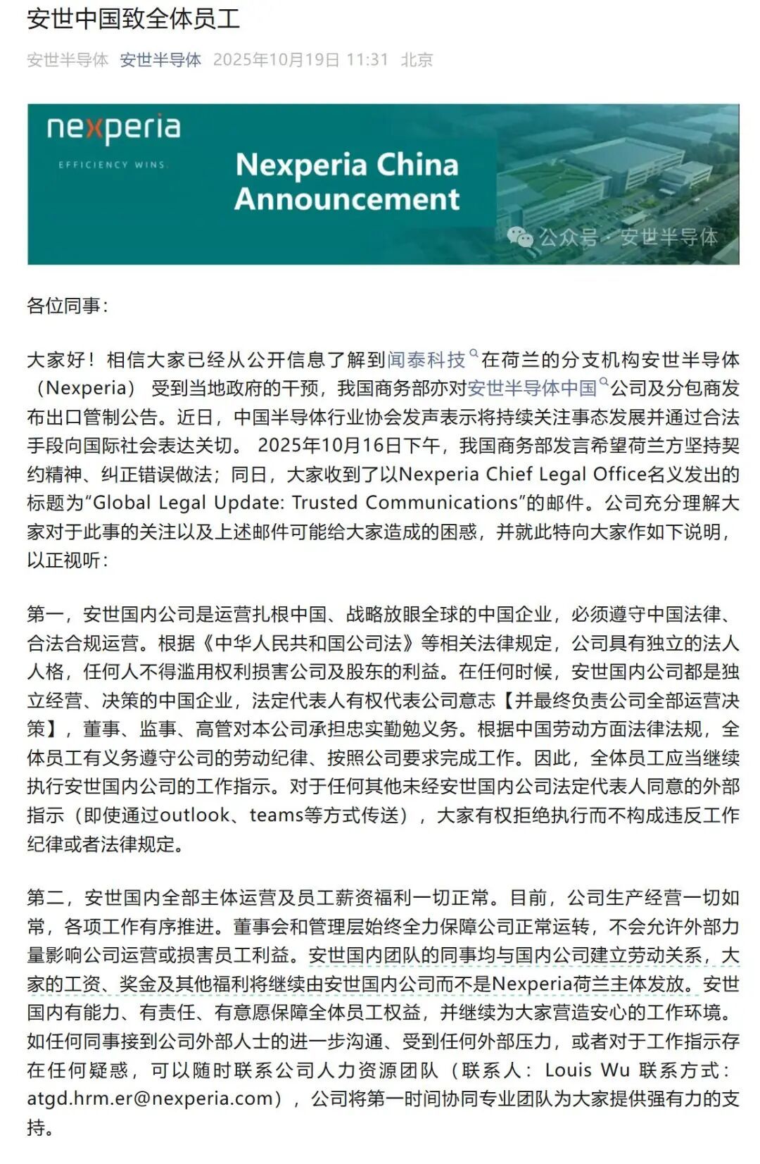 10月17日,安世中国员工账号遭荷兰总部封禁。闻泰科技回应称,为应对欧洲可能切断系统与资金的风险,中国区正推进独立自救,拉通国内供应链以保障客户供应。10月19日,安世中国发公开信安抚员工:国内主体运营及薪资福利均正常,生产经营有序推进;明确国内公司为独立中国企业,员工应执行国内公司指令,有权拒绝未经法定代表人同意的外部指示,且薪资等由国内公司发放,不受荷兰主体影响。