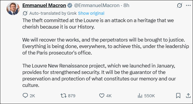 10月19日,法国总统马克龙在社交媒体发文,抨击盗窃案是对人们所珍视遗产的侵犯,承诺追回文物并将作案者绳之以法。