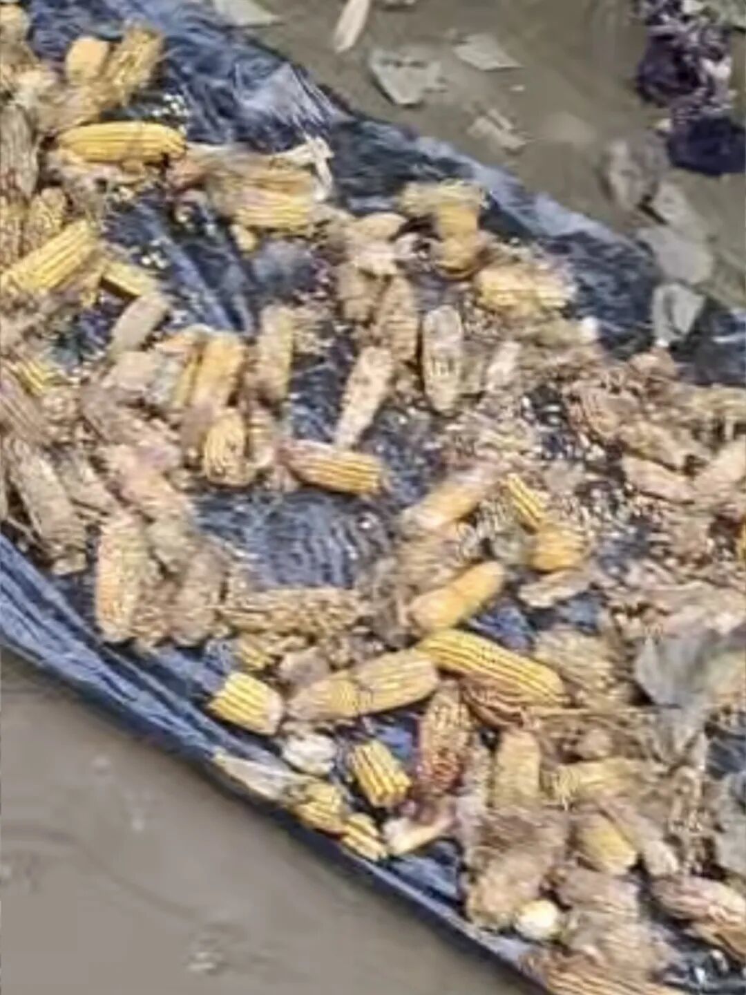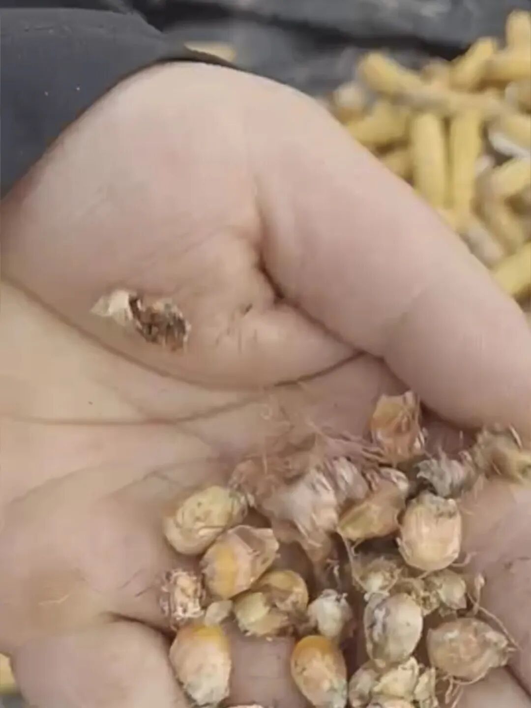 而长在积水田地的玉米等不了太久。在跟南风窗记者视频通话过程中,王力掰开一些玉米的外衣,视频显示,里面的籽粒有些泛黑,有些已经生芽。