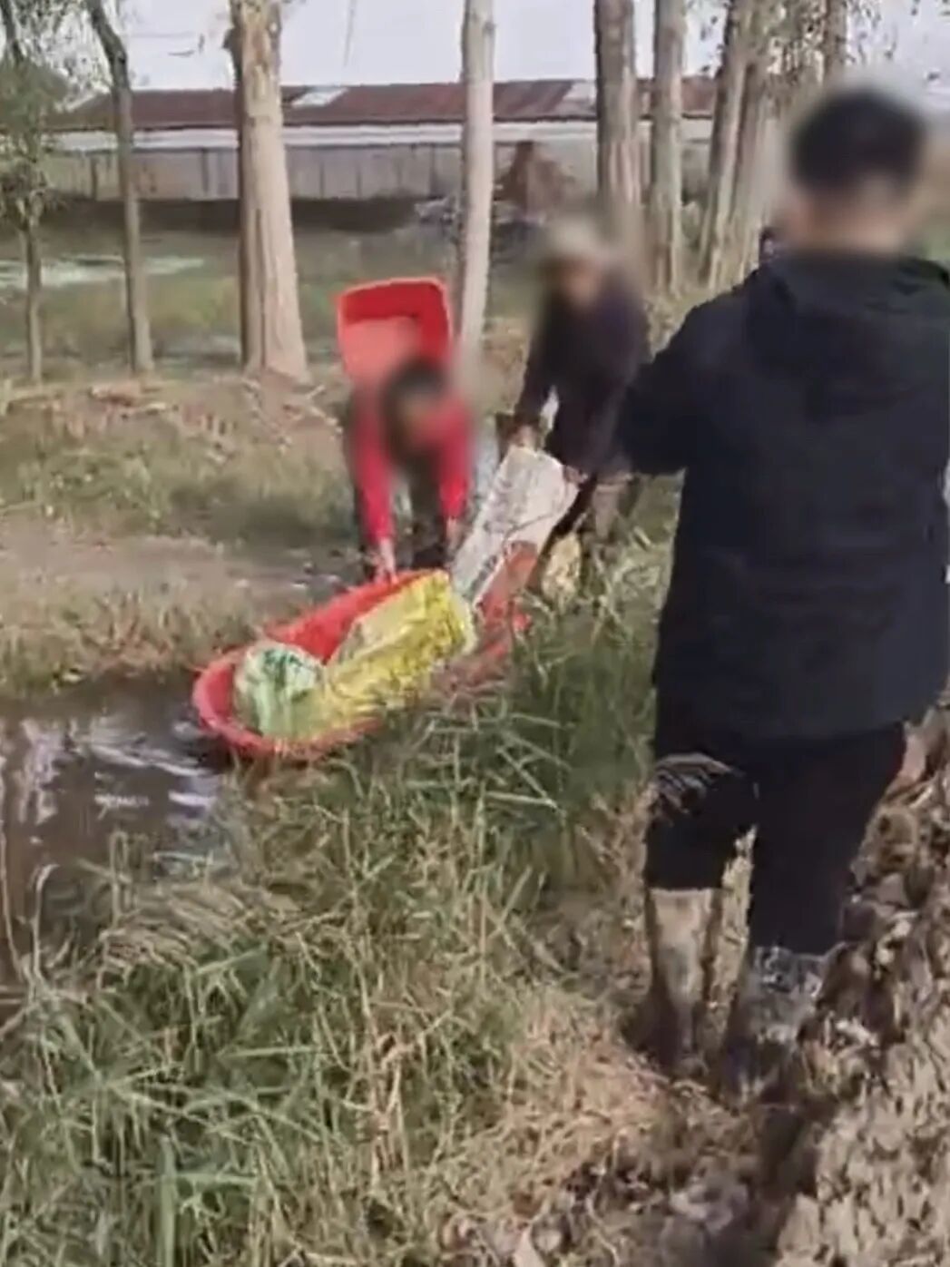 沟渠尽头,村民们将装着玉米的澡盆拉上岸/受访者供图