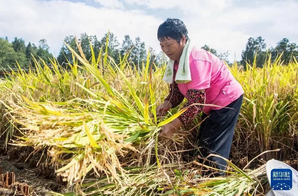郑大玮指出,北方农业的作物结构和育种方向也需要改变。图为稻农在稻田里抢收稻谷(无人机照片)/新华社记者 唐奕 摄