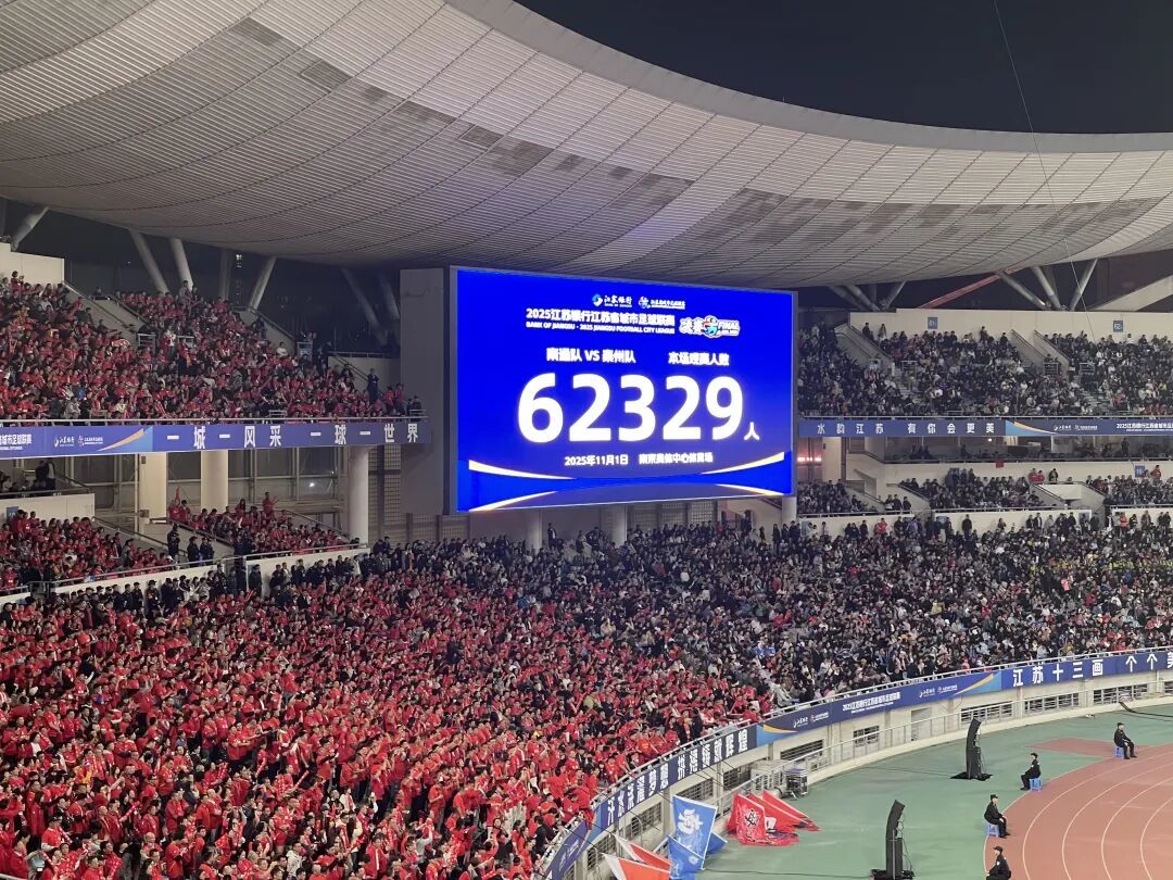 决赛当晚有62329名观众来到现场观看比赛,南京奥体中心接连第7次刷新“苏超”单场上座纪录。