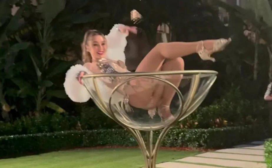 在一张活动照片中,一名舞女在一个巨大的镀金马提尼酒杯中摆造型,而视频片段则展现了歌舞女郎们表演着精心编排的舞蹈。其他照片则显示,现场有一个巨大的主题冰雕用于冰镇酒水,还有各式各样、琳琅满目的甜点。