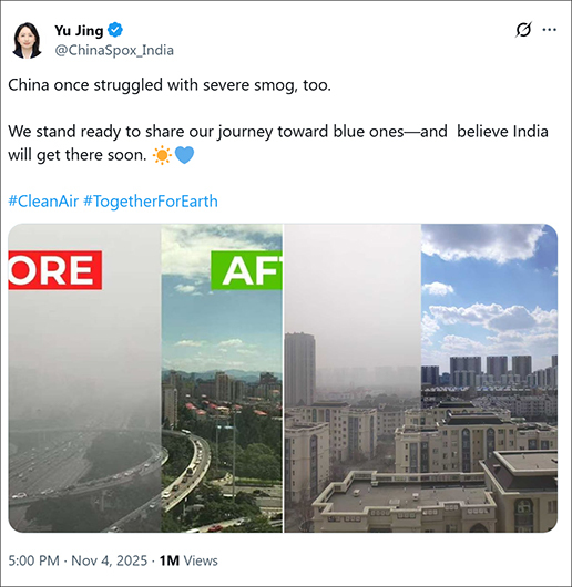 11月4日,中国驻印度大使馆发言人于静在社交平台发文称,“中国也曾饱受雾霾之苦。我们随时愿意分享重见蓝天的治理经验,并坚信印度在不久的将来也能实现这一目标。”