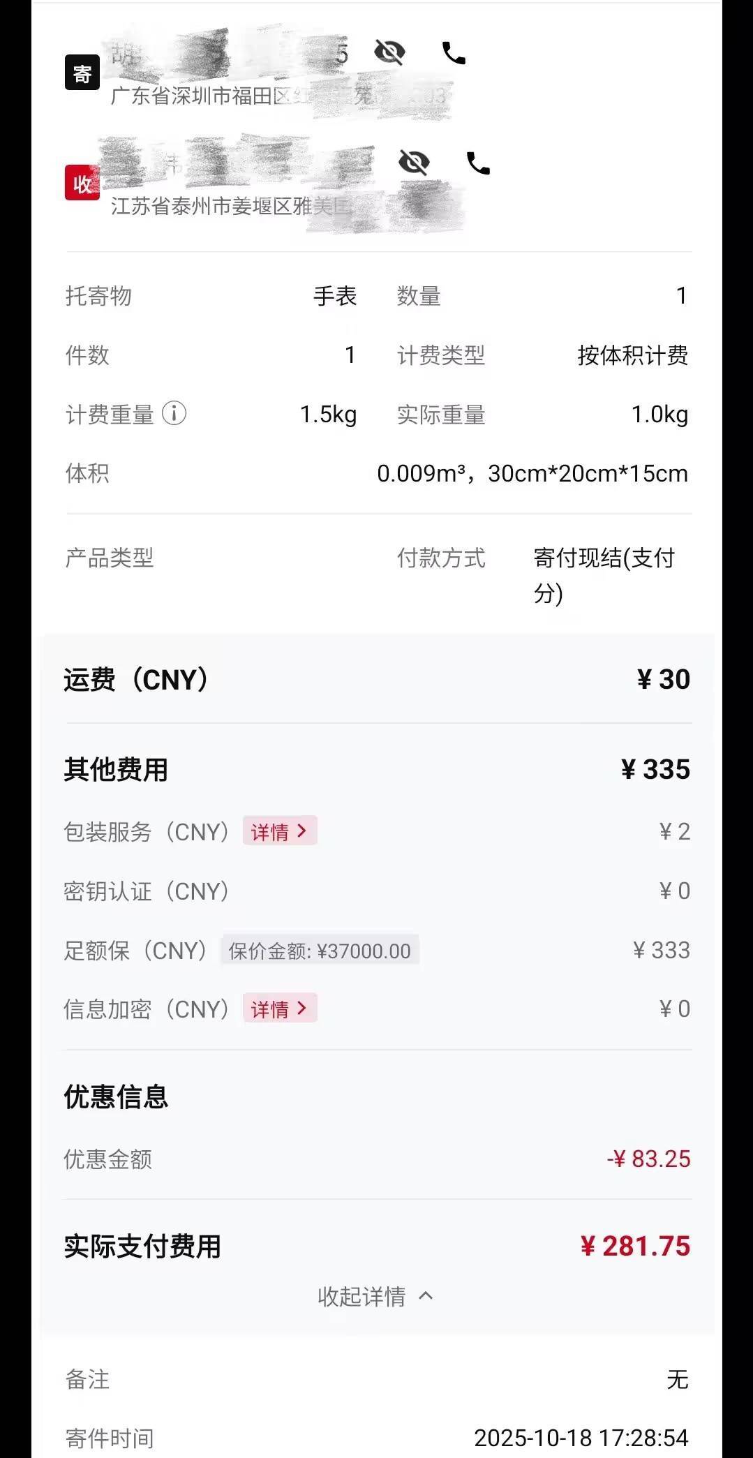 手表丢失后,快递公司工作人员联系罗先生商谈理赔事宜,“333元的保费,足额理赔下来只有3.7万元,一只表只赔1.85万元。我的表是花了40万买的,这个方案我肯定无法接受”。