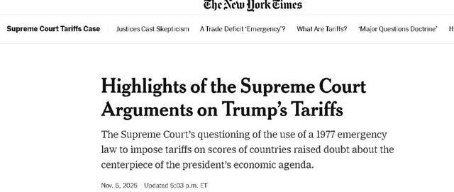 根据《纽约时报》、美国有线电视新闻网(CNN)和英国广播公司(BBC)等多家欧美媒体的报道,这场于北京时间11月5日深夜开始并一直持续到6日凌晨的美国最高法院的官司,事关美方如今单方面对全世界上百个国家和地区加征关税,到底是合法的,还是属于行政越权,并侵犯了企业的合法利益。