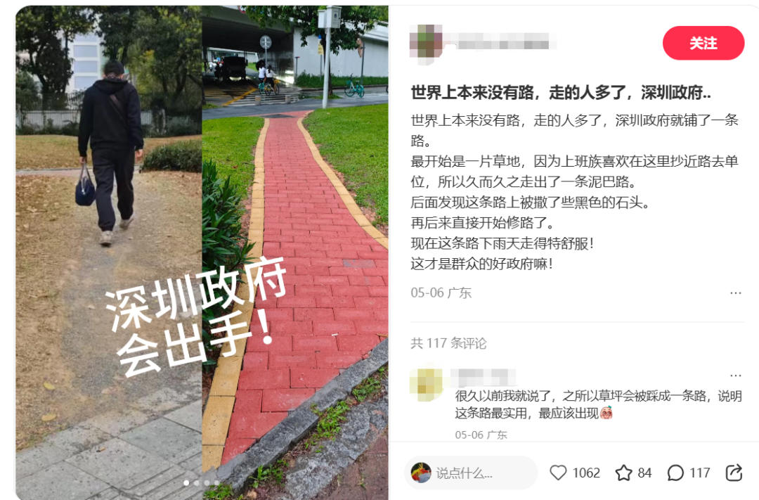 今年5月,深圳又一次登上热搜。原来,某片草地规划不太合理,导致过往行人不得不绕远路。部分“上班族”为了赶时间就频繁横穿草地,久而久之就形成了一条泥巴路。