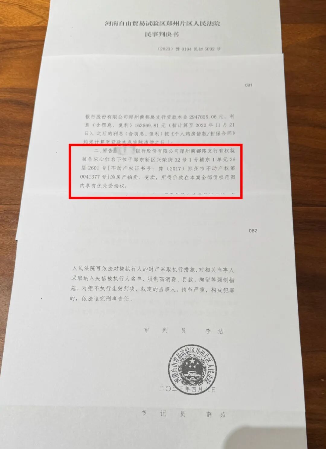河南自由贸易试验区郑州片区人民法院“(2023)豫0194民初5092号”判决书显示,2023年4月6日,该院判决认定宋心红违约,判决生效十日后偿还银行294万余元本金和16万余元利息,某银行郑州商都路支行对宋心红名下位于郑东新区兴荣街32号1号楼东一单元26层2601号、面积为276.28平方米的房产折价、拍卖、变卖所得的价款在其债券范围内优先受偿。